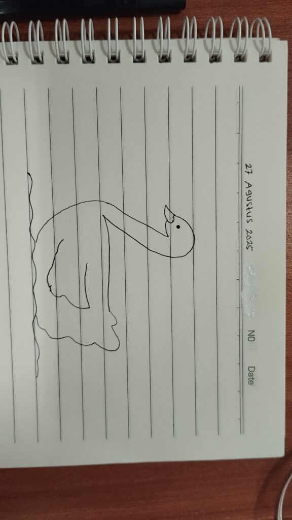 Deskripsi Bebek yang saya gambar : Ketika bebek berada di air dia terlihat tenang akan tetapi sebenarnya dia sedang berusaha sekuat tenaga untuk berenang agar tidak tenggelam