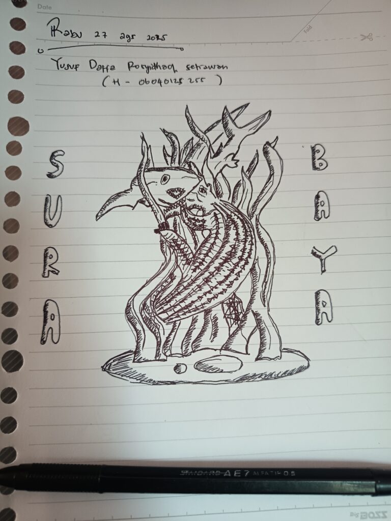 halo, nama ku Yusuf Daffa Rosyidhaq Setiawan dari kelas H-PAI, kenapa saya menggambar logo kota surabaya yaitu sura dan baya, karena saya lahir di surabaya dan arti dari surabaya adalah “berani menghadapi bahaya”, kota ini menjadi lambang semangat perjuangan rakyat Surabaya yang gigih dalam menghadapi ancaman dan bahaya saat revolusi kemerdekaan Indonesia, motivasi saya menggambarkan sura dan baya yakni, saya ingin mencontoh semangat pahlawan terdahulu.