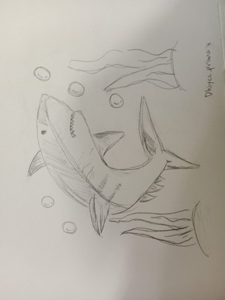 Saya menggambar hiu yang merupakan salah satu predator puncak yang berkuasa di lautan. Menurut saya hiu dapat menggambarkan sosok guru karena guru itu memiliki jiwa yang berwibawa, dihormati, dan memiliki pengaruh besar bagi murid-muridnya. Terima kasihhh 🙂
