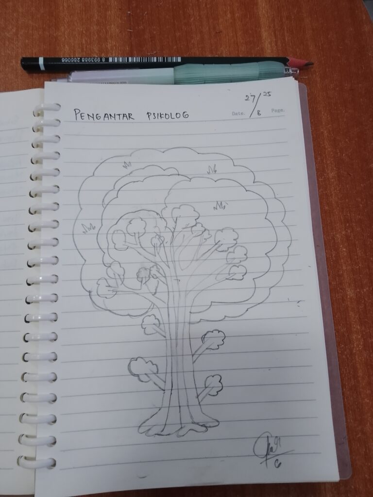 Saya menggambar pohon yang rindang dan Besar karena melambangkan perjalanan kehidupan manusia dari kecil hingga dewasa, Akar pohon yang kokoh menggambarkan manusia harus mempunyai hati yang kuat dan ikhlas, Pohon memerlukan waktu yang lama untuk tumbuh dan berkembang sama seperti manusia yang butuh kesabaran sampai mencapai hasil yang maksimal. Dan akar, daun, dan batang saling berhubungan ibarat seperti manusia saling terhubung antara keluarga, alam, dan masyarakat.