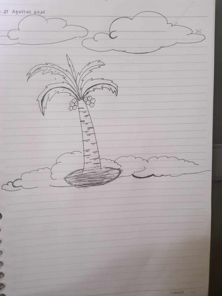 perkenalan nama saya fitrie Ainur Ramadhani saya berasal dari tuban disini saya menggambar pohon kelapa karena pohon kelapa dikenal dengan pohon seribu guna yang sama dengan guru yang bermanfaat untuk banyak orang , pohon kelapa juga digambarkan dengan pohon yang kokoh tinggi yang sama dengan guru yang mandiri dan menaungi para muridnya dengan pengetahuannya , dan saya ingin menjadi seperti pohon kelapa,masih banyak lagi manfaat pohon kelapa yang tidak bisa bisa dijelaskan satu persatu, sekian dari saya gambaran tentang pohon kelapa